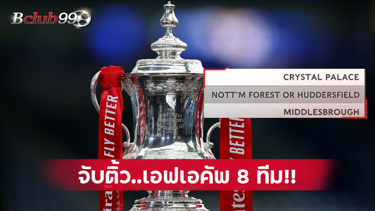 เดอร์สฟิลด์ ทาวน์ ที่จะเตะกันในวันจันทร์ที่ 7 มีนาคมนี้ สรุปผลการประกบคู่ เอฟเอ คัพ รอบ 8 ทีมสุดท้ายคริสตัล พาเลซ (พรีเมียร์ลีก) พบ เอฟเวอร์ตัน (พรีเมียร์ลีก)- น็อตติ้งแฮม ฟอเรสต์ (แชมเปี้ยนชิพ) / ฮัดเดอร์สฟิลด์ ทาวน์ (แชมเปี้ยนชิพ) พบ ลิเวอร์พูล (พรีเมียร์ลีก) – มิดเดิ้ลสโบรช์ (แชมเปี้ยนชิพ) พบ เชลซี (พรีเมียร์ลีก)- เซาธ์แฮมป์ตัน (พรีเมียร์ลีก) พบ แมนเชสเตอร์ ซิตี้ (พรีเมียร์ลีก)ทั้งนี้ การแข่งขันรอบดังกล่าวจะมีขึ้นในสุดสัปดาห์ของวันที่ 19-20 มีนาคม